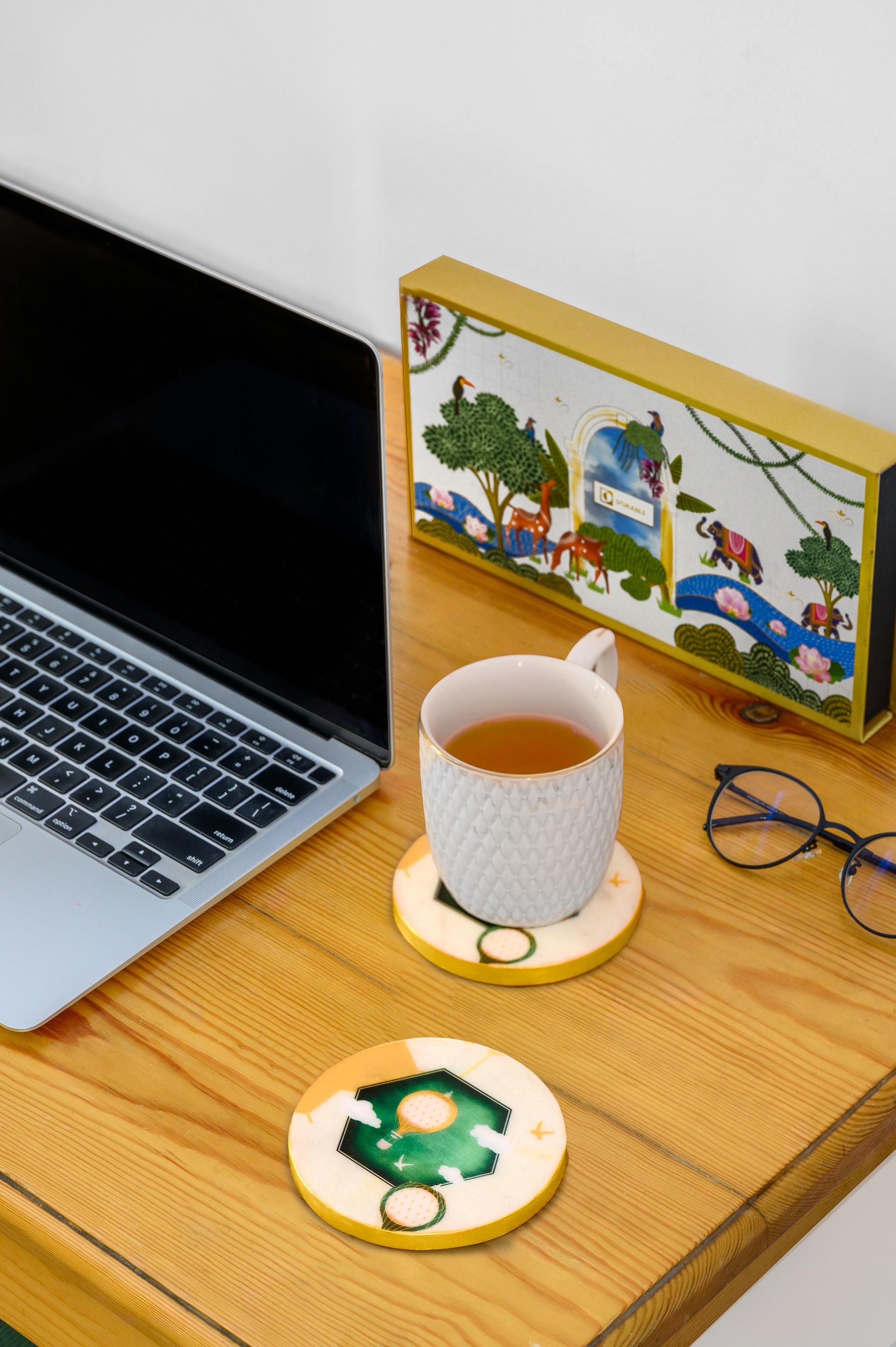 Experience the artistry of "A Seashell's Skyward Journey," a unique piece that beautifully weaves together the ancient Saura art of Odisha and the whimsical hot air balloons of Cappadocia, Turkey. Though the Saura figures aren't depicted on this coaster, the entire design is artistically showcased on our designer table, also available on our website. This coaster features hot air balloons and Saura birds drifting through clouds, waiting to be boarded by the Saura community. For those unfamiliar with Saura art, it is an ancient tribal art form that vividly depicts the daily life of the Saura tribe.